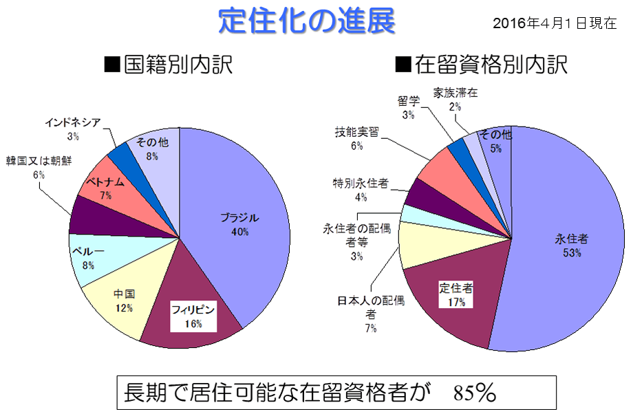 またすでに説明したように、在留資格別で見てみると、本市の外国人の実に85パーセントが、長期で滞在する在留資格を持っており、定住化が着実に進んでいます。