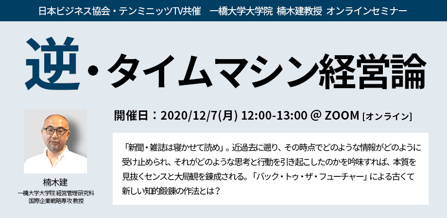 テンミニッツ・アカデミーでは、日本ビジネス協会と共催で楠木建先生(一橋大学大学院 経営管理研究科 国際企業戦略専攻 教授)をお招きして、オンラインセミナーを開催いたします。
